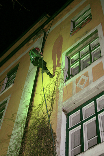 Und wirklich: Plötzlich tauchte an der grün/gelb illuminierten Hauswand beim Richelbräu eine Schattenfigur unter der Dachrinne auf.
